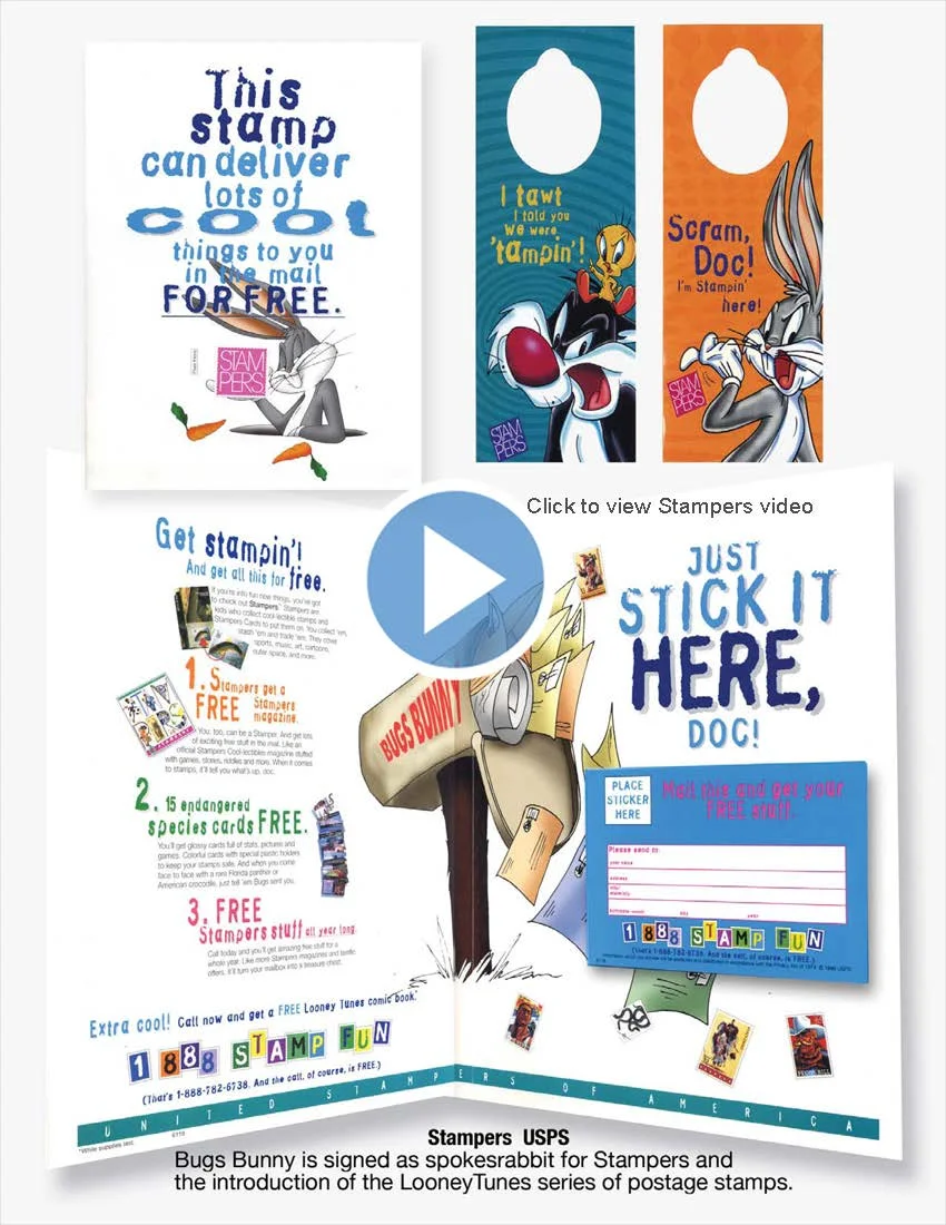 Stampers was a club for kids that used the postage stamp imagery to create collectible products, folio and keepsakes that were kid-centric in design, humor and attitude. A series of trading cards was one of the most popular examples. The campaign was highlighted by the release of Looney Tunes stamps that also attracted great interest from adults.